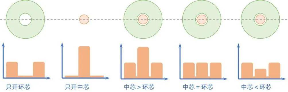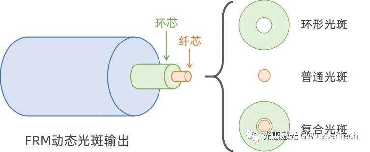 FRM激光器可任意控制纖芯光和環(huán)芯光的功率大小,可以只開中心光或環(huán)形光,也可以兩者同時開,形成普通光斑、環(huán)形光斑、復(fù)合光斑三種模式;若同時開啟可以中芯和環(huán)芯,可以使中芯功率大于環(huán)芯功率,也可以中芯功率小于環(huán)芯功率,或者中芯功率等于環(huán)芯功率,共可切換五種不同光斑形態(tài)。