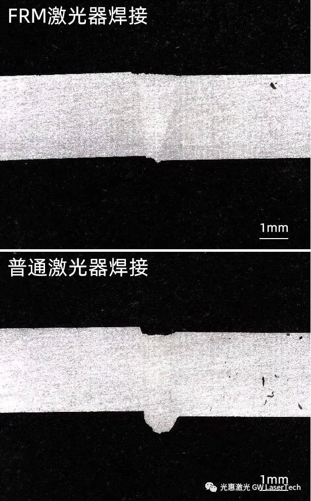 將焊接完后的樣品切開后進行金相觀察。FRM激光器由于環(huán)形光斑的作用,焊接得到的焊縫呈現(xiàn)上寬下窄形貌,上下兩表面基本平整;而普通激光器焊接的焊縫上下熔寬基本齊平,上表面存在塌陷伴隨下表面凸出。