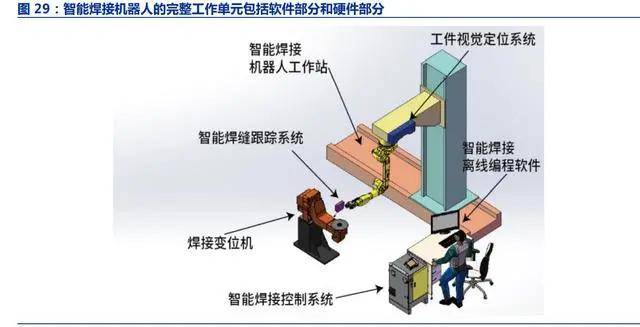 智能焊接機(jī)器人具備免示教功能,專注于鋼結(jié)構(gòu)等非標(biāo)工件的焊接。焊接機(jī)器人分為 示教焊接機(jī)器人和智能焊接機(jī)器人兩類。示教焊接機(jī)器人主要需要人工示教來(lái)編輯焊縫的 加工路徑,由于非標(biāo)準(zhǔn)化操作的示教過(guò)程耗時(shí)較長(zhǎng),因此示教焊接機(jī)器人大多應(yīng)用于重復(fù)、 標(biāo)準(zhǔn)化的加工中;而智能焊接機(jī)器人通過(guò)智能焊接離線編程軟件、智能焊縫跟蹤系統(tǒng)、智 能焊接控制系統(tǒng)來(lái)生成焊縫加工路徑,可以實(shí)現(xiàn)免示教功能,縮短調(diào)試周期,進(jìn)一步提升 智能焊接機(jī)器人的自動(dòng)化程度,更適合小批量非標(biāo)工件的柔性加工過(guò)程。