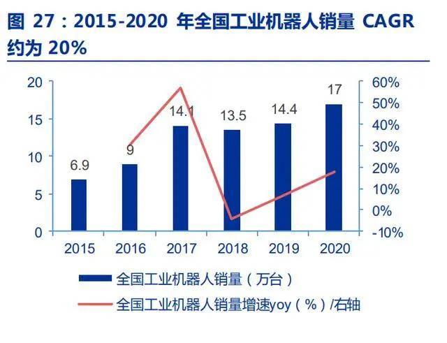 工業(yè)機(jī)器人產(chǎn)業(yè)地位提升,焊接機(jī)器人有望填補(bǔ)焊工缺口。國(guó)務(wù)院印發(fā)的《“十三五” 國(guó)家戰(zhàn)略性新興產(chǎn)業(yè)發(fā)展規(guī)劃》,進(jìn)一步將工業(yè)機(jī)器人產(chǎn)業(yè)作為國(guó)家新型產(chǎn)業(yè)重點(diǎn)之一, 推進(jìn)我國(guó)工業(yè)機(jī)器人產(chǎn)業(yè)快速發(fā)展。在政策加碼下,2015-2020 年,我國(guó)工業(yè)機(jī)器人市場(chǎng) 規(guī)模持續(xù)擴(kuò)大,工業(yè)機(jī)器人產(chǎn)量 CAGR 約為 48%,工業(yè)機(jī)器人銷量 CAGR 約為 20%。焊 接機(jī)器人是我國(guó)最主要的工業(yè)機(jī)器人之一,操作簡(jiǎn)單、能實(shí)現(xiàn)連續(xù)工作、生產(chǎn)效率高,而 且可以克服焊工在生產(chǎn)中的局限性,因此被廣泛應(yīng)用于消費(fèi)電子、汽車制造、工程機(jī)械、 城市建設(shè)等領(lǐng)域。焊接機(jī)器人產(chǎn)業(yè)的蓬勃發(fā)展,有望緩解工廠“招焊工難”的問(wèn)題,逐步 填補(bǔ)部分焊工供需缺口。