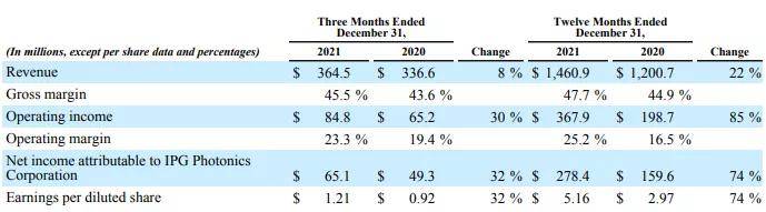 2月15日,光纖激光器巨頭IPG Photonics發(fā)布了2021年第四季度報(bào)告。報(bào)告顯示,IPG在2021年實(shí)現(xiàn)營(yíng)收14.61億美元,同比增長(zhǎng)22%;凈利潤(rùn)2.78億美元,同比增長(zhǎng)74%;毛利率47.7%,同比回升2.8個(gè)百分點(diǎn)(去年為44.9%)。