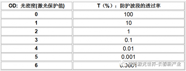 2、OD: 光密度(激光保護(hù)值),T:防護(hù)波段的透過率