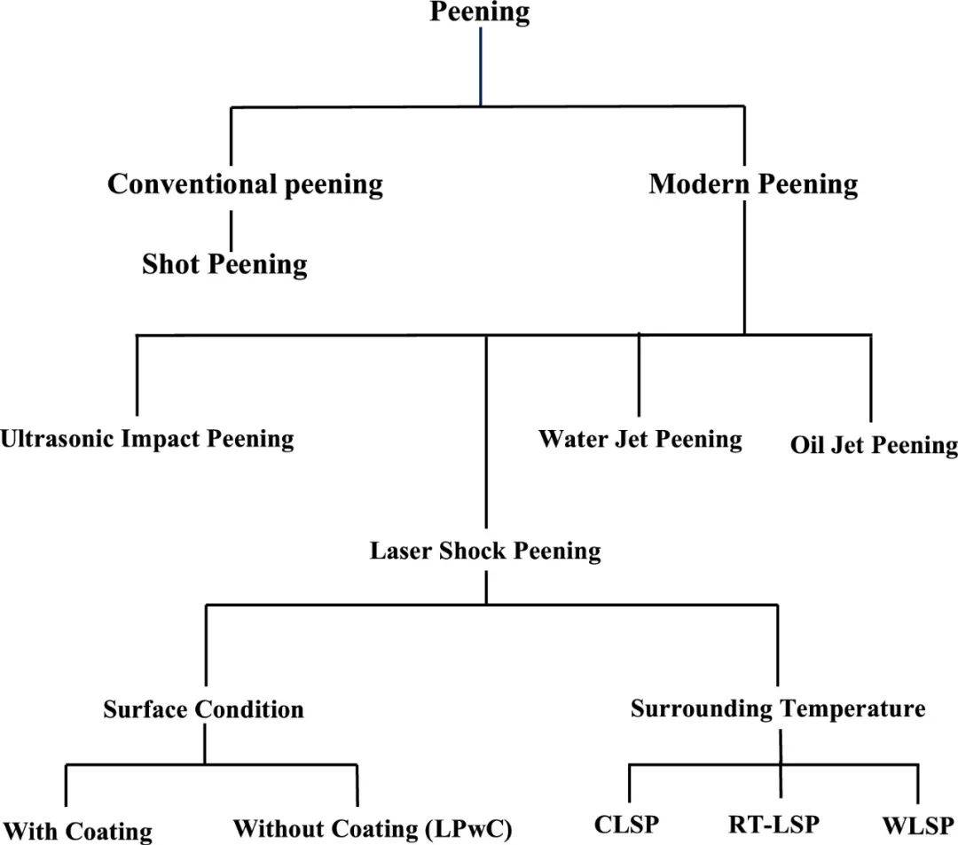 從噴丸本身的發(fā)展和發(fā)明開始,新的方法和改進(在傳統(tǒng)和現(xiàn)代噴丸)在不同的時間發(fā)生了變化。因此,今天我們有大約六種可用的噴丸方法,其中大多數(shù)都或多或少具有獨特和顯著的優(yōu)點和局限性。雖然所涉及的原理沒有變化,但激光沖擊沖擊強化是根據(jù)待沖擊試樣的表面狀況和周圍溫度進行分類的,如圖2所示。