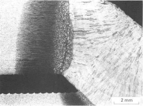 角焊縫宏觀切面表現(xiàn)為粗晶熱影響區(qū)(含氫裂紋)、暗腐蝕細晶熱影響區(qū)和輕腐蝕臨界區(qū)。