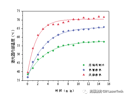 ▲ 不同風冷方案激光器輸出1.5kW激光時溫度隨時間的變化