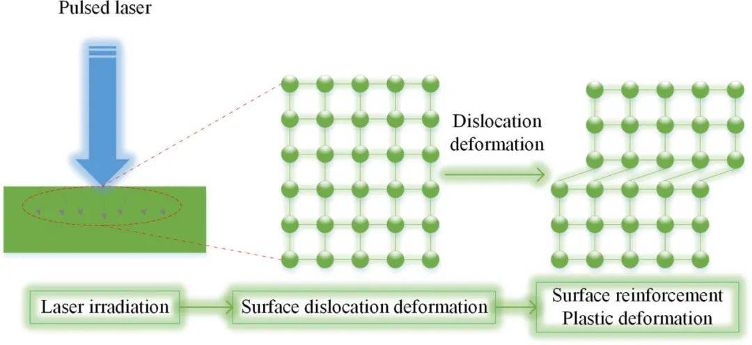 不同能量密度激光清洗下的飛機蒙皮表面顯微硬度值如圖17(a)所示,表面殘余應力值如圖17(b)所示。如圖17(a)所示,激光清洗后蒙皮表面的顯微硬度普遍增加,表明脈沖激光使飛機蒙皮表面形成硬化層。從圖17(b)可以看出,激光清洗后飛機蒙皮表面存在顯著的殘余拉應力,且隨著激光能量密度的增加而增加,表明脈沖激光導致蒙皮表面塑性變形。圖18是激光清洗過程中飛機蒙皮表面變化的示意圖。當脈沖激光照射到飛機蒙皮表面時,蒙皮表面的底漆層和覆鋁層吸收激光能量,振動、破裂并蒸發(fā)。BMS10-11涂層的破裂導致產(chǎn)生的沖擊波作用于蒙皮表面,在蒙皮表面形成致密穩(wěn)定的位錯結(jié)構(gòu),從而使蒙皮表面硬化。同時,蒙皮表面的殘余應力被釋放和重新分布,導致塑性變形。綜上所述,激光清洗可以提高飛機蒙皮表面的硬度,產(chǎn)生影響部件穩(wěn)定性的殘余拉應力,這是目前工程部門需要解決的問題。