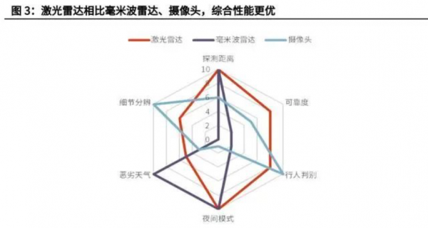 激光雷達(dá)綜合性能最優(yōu),智能駕駛感知層面硬件之首。根據(jù)前瞻研究院,從可靠度、行人判別、夜間模式、惡劣天氣環(huán)境、細(xì)節(jié)分辨、探測(cè)距離等方面來(lái)對(duì)比,激光雷達(dá)是三種環(huán)境傳感器中綜合性能最好的一種,而且,其產(chǎn)品優(yōu)勢(shì)將隨著消費(fèi)與智能駕駛需求提升而愈發(fā)凸顯。