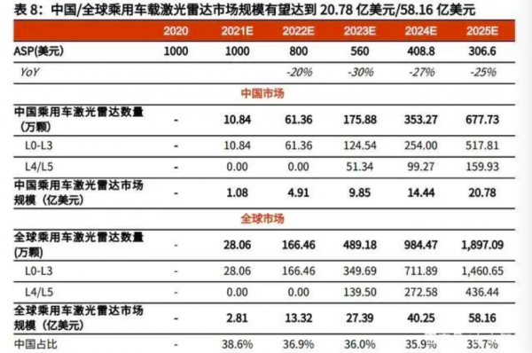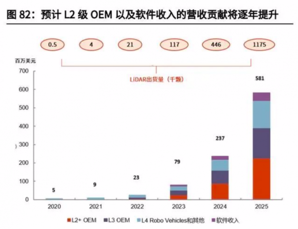 ①目前激光雷達(dá)ASP逐年下探趨勢(shì)明確,目前價(jià)格最低的激光雷達(dá)低至百美元。②搭載激光雷達(dá)顆數(shù)估算:L0-L2級(jí)0顆;L3級(jí)1.5顆;L4/L5級(jí)3.5顆(考慮到2025年高等級(jí)自動(dòng)駕駛技術(shù)尚不成熟,未來(lái)單車(chē)搭載率仍有望增加)