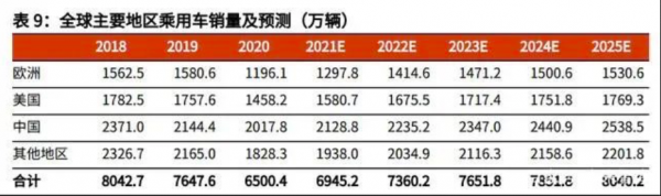 ①中國(guó)燃油乘用車(chē)銷(xiāo)量占比自2016年開(kāi)始基本穩(wěn)定,假設(shè)全球乘用車(chē)格局無(wú)顯著變化,中性情境下,我們預(yù)測(cè)趨于穩(wěn)定;②自2015年開(kāi)始,中國(guó)新能源乘用車(chē)在全球市場(chǎng)的占比強(qiáng)勁,雖然2020年受到政策環(huán)境和疫情等影響,全球碳排放壓力,疊加海外疫情下歐美新能源車(chē)政策支持力度較強(qiáng),導(dǎo)致中國(guó)新能源車(chē)銷(xiāo)量占比有所下降,但是2020年7-12月中國(guó)新能源車(chē)市場(chǎng)已開(kāi)始逐步恢復(fù),2021年前二季度增速提速明顯;③乘聯(lián)會(huì)根據(jù)一、二季度實(shí)際銷(xiāo)量數(shù)據(jù)預(yù)測(cè)得出,2021年中國(guó)新能源車(chē)銷(xiāo)量占比達(dá)到46.5%,考慮到中國(guó)造車(chē)新勢(shì)力國(guó)內(nèi)銷(xiāo)量節(jié)節(jié)攀升,中國(guó)新能源車(chē)發(fā)展全球領(lǐng)先,中性情境下,我們以每年增長(zhǎng)0.5%的滲透率外推,至2024年穩(wěn)定。