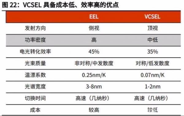 EEL激光器的發(fā)光面位于半導(dǎo)體晶圓的側(cè)面,具備高光輸出功率、散熱性好等優(yōu)勢(shì),但往往生產(chǎn)成本高且一致性難以保障;VCSEL激光器的發(fā)光面與半導(dǎo)體晶圓平行,更容易與平面化的電路芯片鍵合,同時(shí)能夠提高光調(diào)制的效率。與EEL相比,VCSEL具備成本低、效率高、壽命長(zhǎng)的優(yōu)勢(shì),傳統(tǒng)的VCSEL激光器存在發(fā)光密度功率低、測(cè)距距離不足50m的缺陷,近年來(lái)國(guó)內(nèi)外多家VCSEL激光器公司紛紛開(kāi)發(fā)了多層結(jié)VCSEL激光器,將其發(fā)光功率密度提升了5~10倍,這為應(yīng)用VCSEL開(kāi)發(fā)長(zhǎng)距激光雷達(dá)提供了可能。