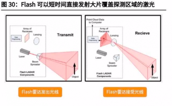 (3)全固態(tài):所有部件都是固定的,包括OPA光學(xué)相控陣激光雷達(dá)、FLASH閃光激光雷達(dá)。①OPA利用光源干涉技術(shù)實(shí)現(xiàn)光線角度偏轉(zhuǎn),通過(guò)控制陣列中相鄰發(fā)射光線的相位差實(shí)現(xiàn)3D空間的掃描,達(dá)到與旋轉(zhuǎn)機(jī)械式雷達(dá)一樣的效果,優(yōu)點(diǎn)是掃描速度快、精度高,但是該技術(shù)對(duì)材料和工藝的要求都極為苛刻,目前尚處于實(shí)驗(yàn)室前期產(chǎn)品,短期內(nèi)難以實(shí)現(xiàn)商業(yè)化。②FLASH類(lèi)似于一個(gè)照相機(jī),在短時(shí)間內(nèi)直接向前方發(fā)射出一大片覆蓋探測(cè)區(qū)域的激光,通過(guò)高度靈敏的接收器實(shí)現(xiàn)對(duì)環(huán)境周?chē)鷪D像的繪制。由于結(jié)構(gòu)簡(jiǎn)單、尺寸可以做的很小、信息量較大,F(xiàn)lash閃光激光雷達(dá)是目前純固態(tài)激光雷達(dá)最主流的技術(shù)方案。然而由于需要短時(shí)間內(nèi)發(fā)射大面積的激光,F(xiàn)lash在探測(cè)精度和探測(cè)距離上會(huì)受到較大的影響,目前主要用于較低速的無(wú)人駕駛車(chē)輛,例如無(wú)人外賣(mài)車(chē)、無(wú)人物流車(chē)等,代表品牌包括Ibeo、大陸、Ouster、法雷奧等。