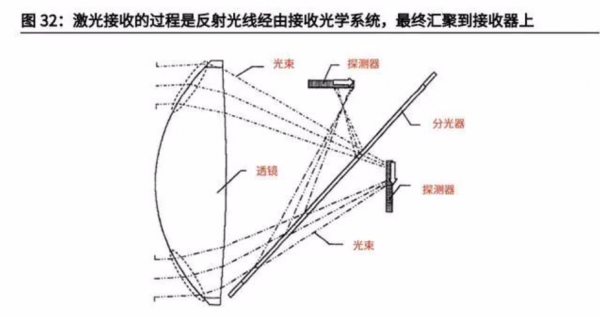 激光接收系統(tǒng)由接收光學(xué)系統(tǒng)和光電探測(cè)器兩部分組成。激光器發(fā)射的激光照射到障礙物以后,通過(guò)障礙物的反射,反射光線會(huì)經(jīng)由鏡頭組匯聚到接收器上,這里的鏡頭組即激光雷達(dá)接收光學(xué)系統(tǒng),涉及到的結(jié)構(gòu)包括透鏡、窄帶濾光片、分束器等。①透鏡:接收光學(xué)系統(tǒng)利用凸透鏡改變?nèi)肷涔獾墓饴?,使之匯聚到探測(cè)器以降低光的損耗。②窄帶濾光片:可以控制接收光束的波長(zhǎng),從而剔除和過(guò)濾掉散雜光,確保傳感器接收到的光信號(hào)準(zhǔn)確無(wú)誤。③分束鏡:分光器利用光的衍射原理,實(shí)現(xiàn)光波能量的分路與合路,將接收的探測(cè)光分為多束光纖射入光電探測(cè)器陣列。