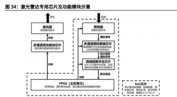 現(xiàn)階段主控芯片F(xiàn)PGA為行業(yè)主流,遠(yuǎn)期企業(yè)自研SoC有望逐步替代。激光雷達(dá)終端信息處理系統(tǒng)的任務(wù)是既要完成對(duì)各傳動(dòng)器件、激光器、掃描旗艦及各信號(hào)處理電路的同步協(xié)調(diào)與控制,又要對(duì)接收端送出的信號(hào)進(jìn)行放大處理和數(shù)模轉(zhuǎn)換,經(jīng)由信息處理模塊計(jì)算,獲取目標(biāo)表面形態(tài)、物理屬性等特性,最終建立物體模型?,F(xiàn)階段最常用的主控芯片是FPGA芯片,但隨著主流廠商對(duì)于性能及整體系統(tǒng)需求的提升,信息處理系統(tǒng)發(fā)展逐步向企業(yè)自研專用單光子接收端片上集成芯片(SoC)遷移,通過(guò)片內(nèi)集成探測(cè)器、前端電路、算法處理電路、激光脈沖控制等模塊,能夠直接輸出距離、反射率信息。目前禾賽科技、Mobileye、英特爾等已率先布局SoC技術(shù),未來(lái)隨著線列、面陣規(guī)模的不斷增大,逐步升級(jí)CMOS工藝節(jié)點(diǎn),單光子接收端SoC將實(shí)現(xiàn)更強(qiáng)的運(yùn)算能力、更低的功耗、更高的集成度,同時(shí)具備器件自主可控的優(yōu)勢(shì),因此更加適合大規(guī)模量產(chǎn),或?qū)⒅鸩酱嬷骺匦酒現(xiàn)PGA。