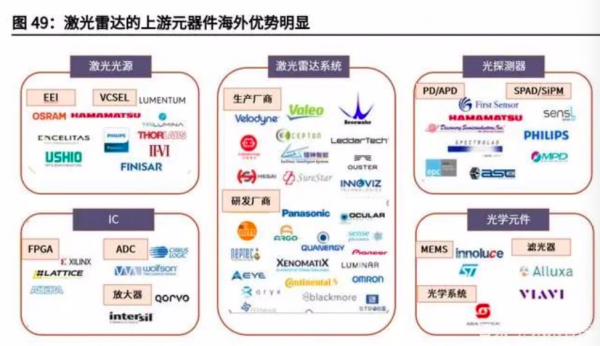 國(guó)內(nèi)廠商奮起追趕,性能差距逐漸縮小,有望改善上游格局。伴隨技術(shù)資金和資源的不斷投入,近幾年國(guó)內(nèi)上游廠商正在崛起,與海外龍頭企業(yè)的性能差距逐漸縮小,同時(shí)兼具成本優(yōu)勢(shì)。我們認(rèn)為,在中美貿(mào)易摩擦大背景下,供應(yīng)鏈風(fēng)險(xiǎn)將推動(dòng)高科技零部件本土化,加上激光雷達(dá)廠商也在布局自主研發(fā)設(shè)計(jì),未來(lái)有望打破海外絕對(duì)壟斷的格局,實(shí)現(xiàn)國(guó)產(chǎn)替代。