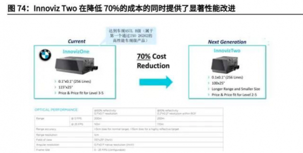 Innoviz的產(chǎn)品包括InnovizOne、InnovizTwo和Innoviz的感知軟件。(1)InnovizOne是專門(mén)為L(zhǎng)3-L5級(jí)自動(dòng)駕駛而設(shè)計(jì)的車(chē)規(guī)級(jí)激光雷達(dá),可達(dá)到等效256線的效果,探測(cè)距離最大250m,量產(chǎn)預(yù)估價(jià)約為1000美元,將于2022年Q2在寶馬量產(chǎn)車(chē)型首次批量應(yīng)用。