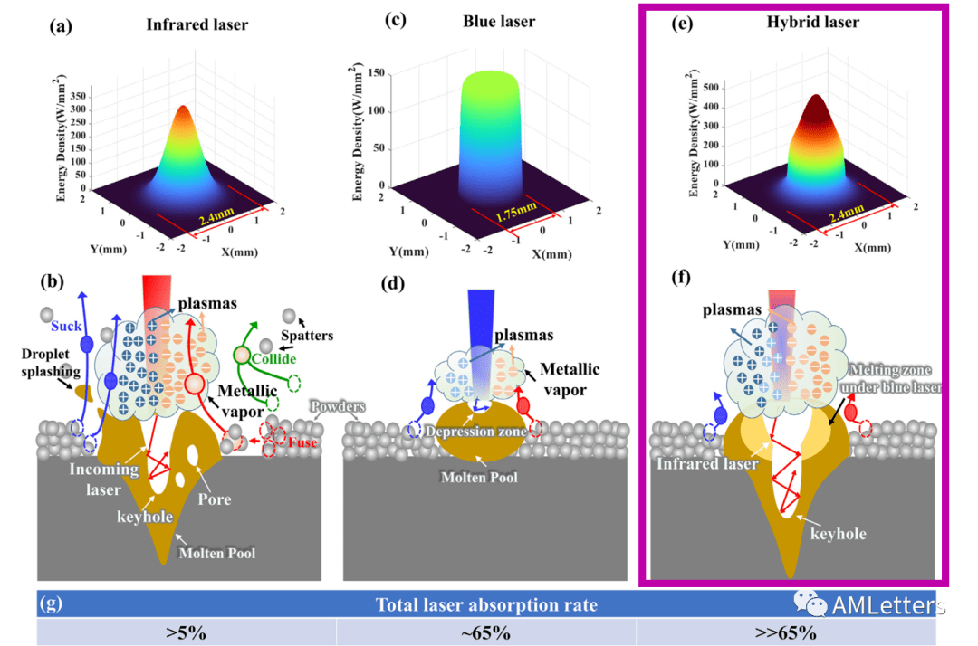(2)高反金屬對(duì)紅外激光的吸收率低,所以加工時(shí)需要較高的功率,但高功率的激光會(huì)導(dǎo)致熔池穩(wěn)定性較差。藍(lán)光激光的波長(zhǎng)較短,高反金屬對(duì)其的吸收率高,但藍(lán)色激光器的功率較低,導(dǎo)致零件的致密度較差。通過(guò)將高功率紅外激光和低功率藍(lán)色激光復(fù)合,可以有效解決以上兩個(gè)問(wèn)題。