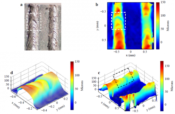 圖2:a 鋁合金熔融軌跡實際照片;b 雙波長全息術(shù)測量的鋁合金熔融軌跡;c 雙波長全息術(shù)測量的鋁合金熔融軌跡3D 形態(tài);d 局部圖(b中白色框出的區(qū)域)圖 2 對比結(jié)果表明了雙波長全息術(shù)對熔融軌跡 3D 形貌測量的可靠性。熔融軌跡中的人字形結(jié)構(gòu)清晰可見。