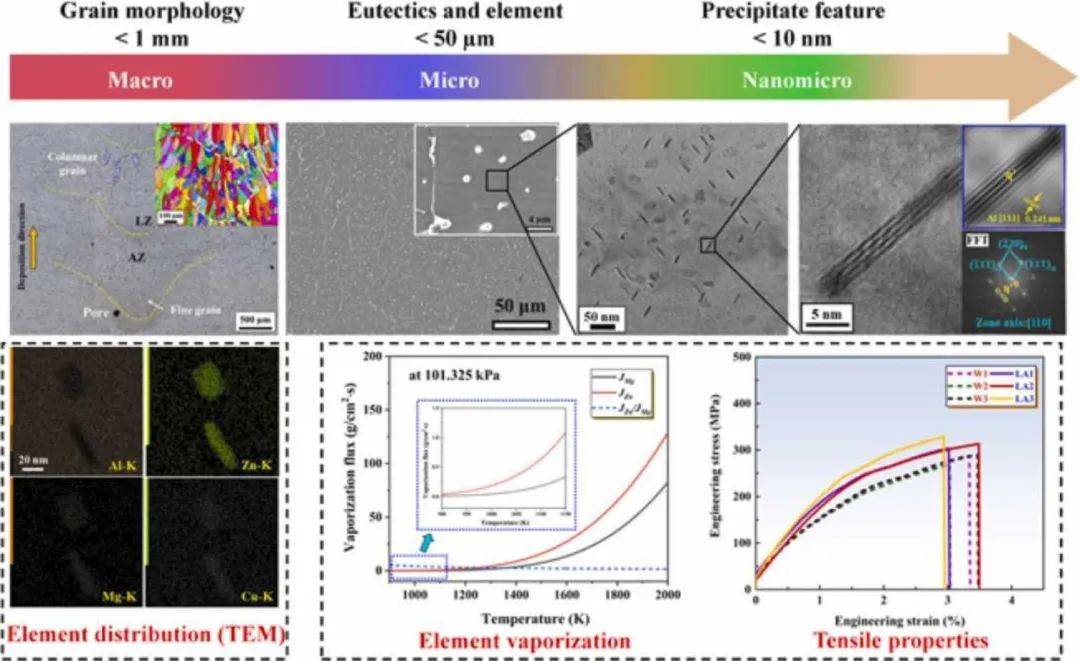 為了研究增材制造Al-Zn-Mg-Cu合金的可行性,提出了一種脈沖激光-電弧混合工藝。采用多尺度表征方法,從晶粒形貌、晶體結(jié)構(gòu)、元素分布和納米析出相等方面研究了合金的微觀組織演變。研究了Al-Zn-Mg-Cu合金在汽化過(guò)程中汽化通量的存在,揭示了元素燃燒的機(jī)理。最后,系統(tǒng)地建立了沉積試樣的顯微組織與機(jī)械性能之間的關(guān)系。這些發(fā)現(xiàn)有望為增材制造難成型合金提供一種新的方法。
