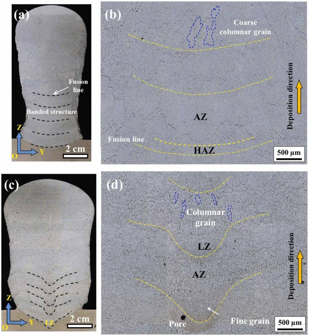 圖4 Al-Zn-Mg-Cu合金試樣YOZ面宏觀組織形貌:(a) 和(b)WAAM試樣;(c)和(d)為L(zhǎng)AHAM標(biāo)本。
