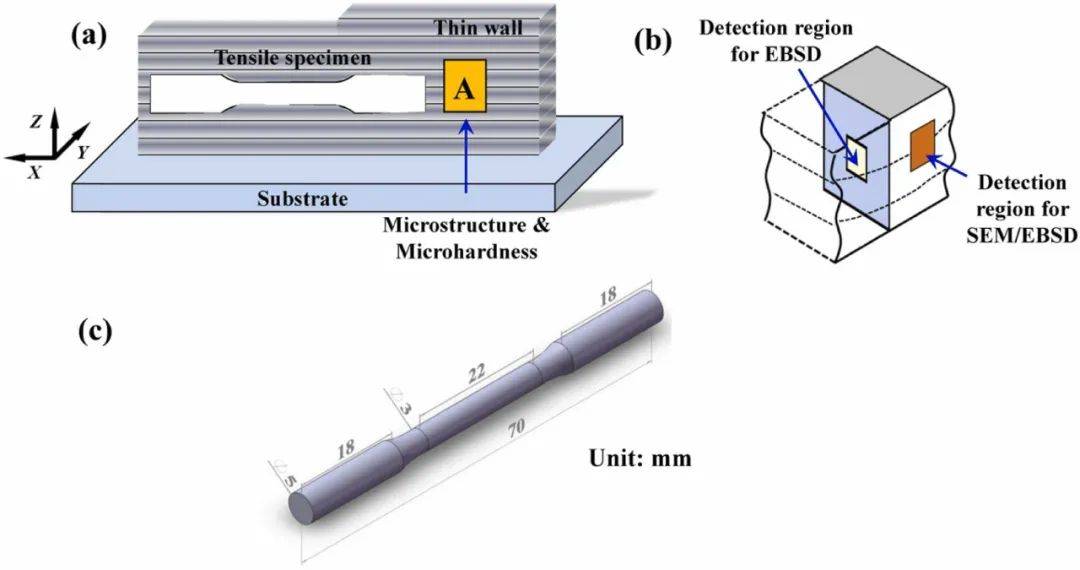 圖2 試樣位置示意圖:(a) Al-Zn-Mg-Cu合金沉積試樣;(b)(a)項(xiàng)A領(lǐng)域詳情;(c)拉伸試樣尺寸。