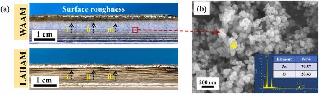 表3顯示了通過(guò)WAAM和LAHAM制造的Al-Zn-Mg-Cu合金試樣的化學(xué)成分。給出的元素含量是三個(gè)試樣的平均值。結(jié)果表明,沉積試樣的鋅含量低于金屬絲的鋅含量。白色松散粉末粘附在WAAM試樣的XOZ平面表面,而LAHAM試樣的表面更亮(圖3a)。根據(jù)能量色散光譜儀(EDS)分析,粉末被確定為ZnO,如圖3b所示。鋅的沸點(diǎn)是1180?K、遠(yuǎn)低于Al(2743?K)。因此,鋅會(huì)顯著蒸發(fā),導(dǎo)致其在增材制造過(guò)程中含量較低。在高溫條件下,鋅的損失是不可避免的,這是通過(guò)焊接和增材制造Al-Zn-Mg-Cu合金的一個(gè)眾所周知的挑戰(zhàn)。Lin等人也通過(guò)WAAM在7055鋁合金中觀察到了同樣的現(xiàn)象。如圖3a所示,在沉積樣品的三個(gè)隨機(jī)位置進(jìn)行三次不同的測(cè)量,每個(gè)樣品總共進(jìn)行9次測(cè)量。LAHAM樣本的Rz值為20.9?±?2.3,而WAAM試樣的值為27.3?±?分別為1.3。因此,WAAM和LAHAM過(guò)程可以被認(rèn)為是穩(wěn)定的。