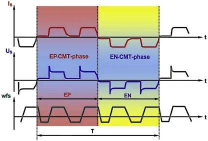 焊接電流(IS)、焊接電壓(US)和送絲速度(Wfs)的變化與EP階段和en階段的脈沖CMT有關(guān)。粉色color-Pulse-phase;黃色color-EN-CMT-phase。