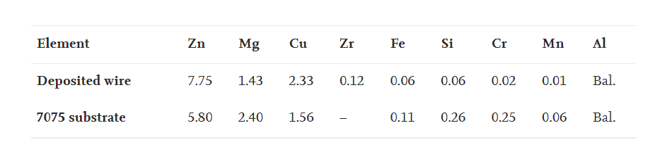 本研究使用的鍍絲為直徑1.2 mm的定制Al-Zn-Mg-Cu合金。在7075鋁合金基板上采用單向沉積法逐層沉積金屬絲。對(duì)基材表面的氧化物和雜質(zhì)進(jìn)行機(jī)械清洗,然后進(jìn)行丙酮脫脂。用x射線熒光光譜法(XRF)測(cè)量導(dǎo)線和基板的化學(xué)成分,如表1所示。