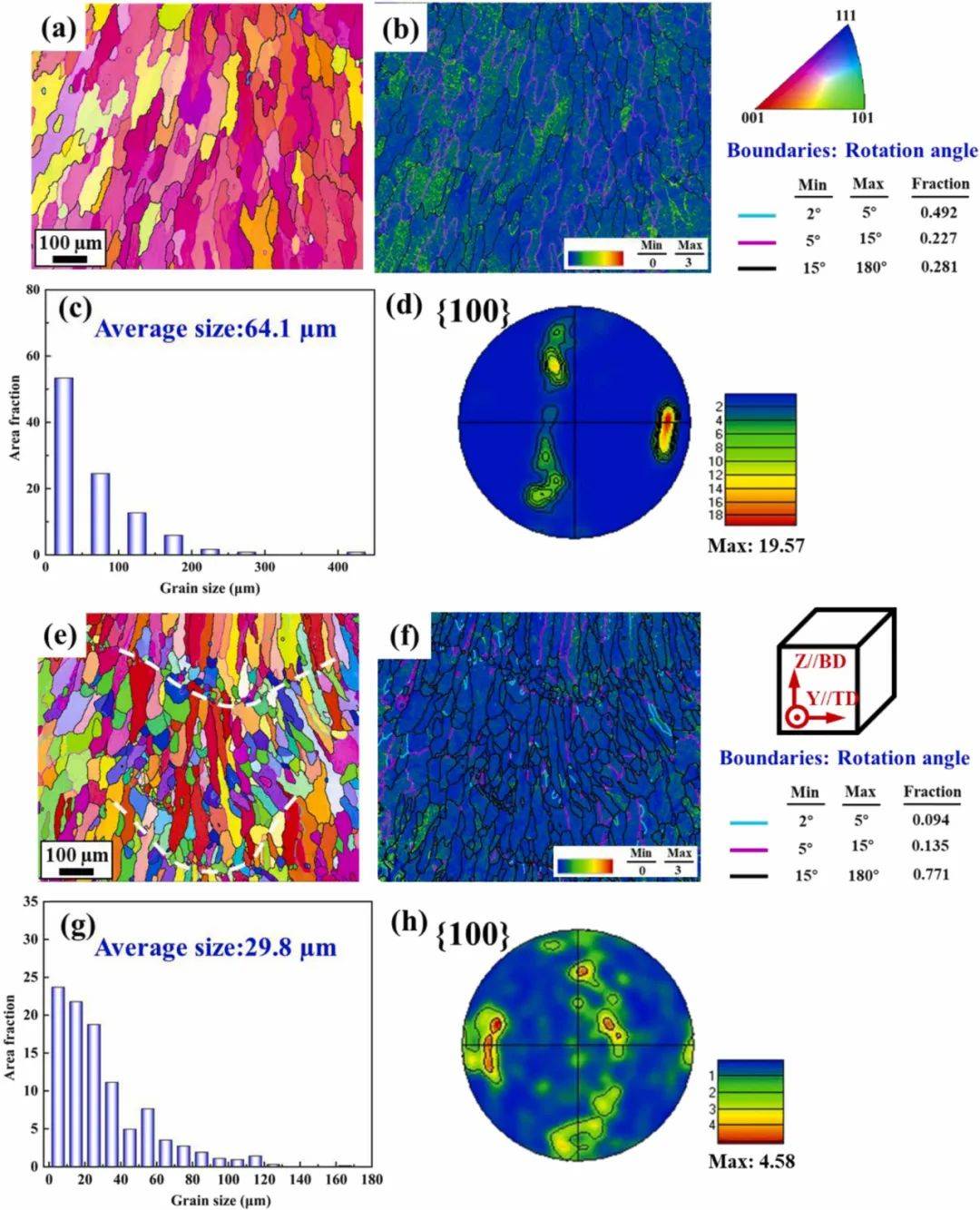 圖5 WAAM樣品的EBSD掃描圖像,與BD平行:(a)逆極點(diǎn)圖(IPF),(b)KAM圖和取向角分布,(c)粒度分布,(d){100}極點(diǎn)圖;LAHAM樣品的EBSD掃描圖像:(e)IPF,(f)KAM圖和取向角分布,(g)粒度分布,(h){100}極圖。