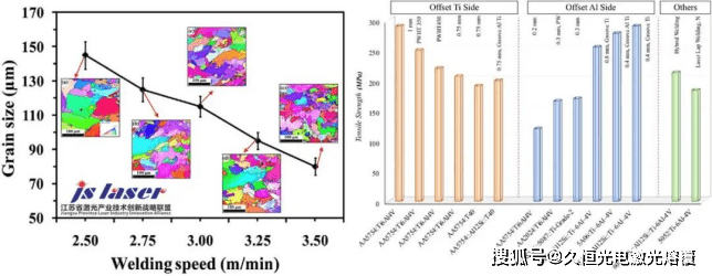 圖4 鈦合金與其他監(jiān)護(hù)材料繼續(xù)擰異種激光焊接時(shí)得到的顯微組織和拉伸強(qiáng)度