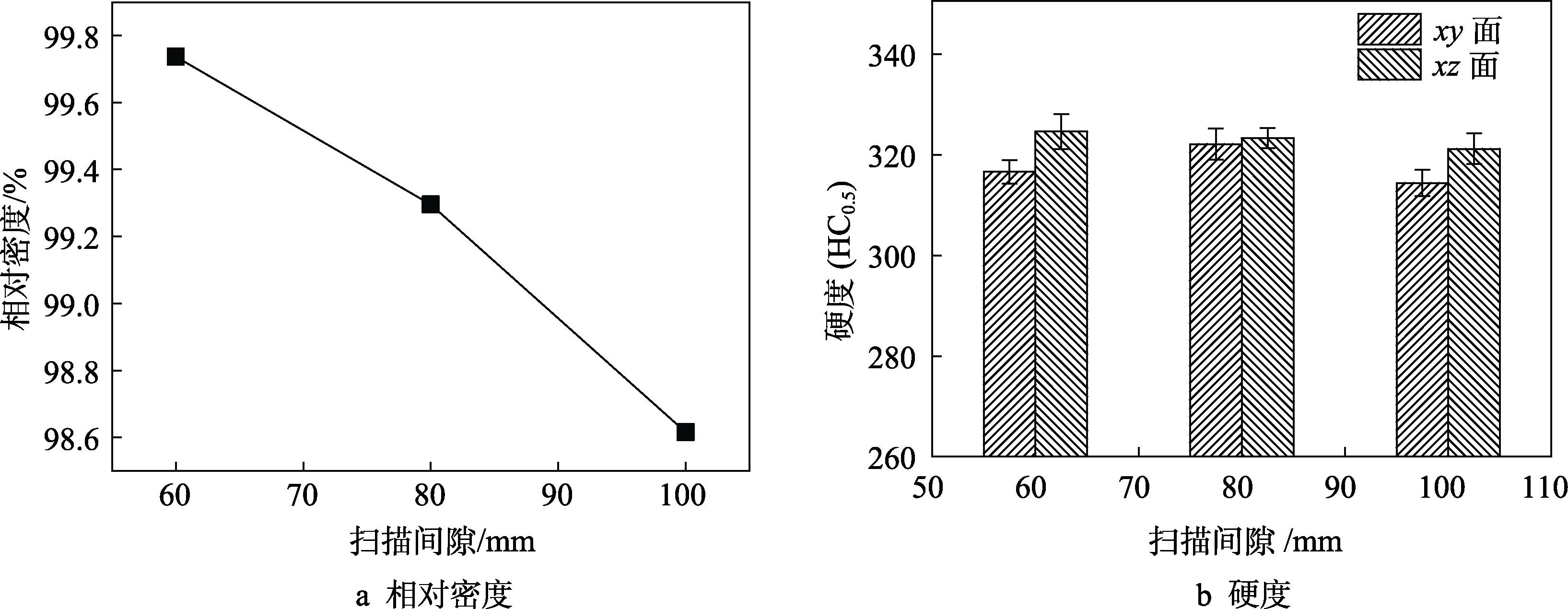 圖6為不同掃描間隙下試樣的相對密度及硬度。由圖6a可知,試樣相對密度隨著掃描間隙的減小而逐漸升高。試樣相對密度隨掃描間隙的演變規(guī)律與圖3a及圖5的微觀組織觀察相吻合。隨著掃描間隙的減小,激光能量密度升高,試樣微觀缺陷減少,相對密度隨之升高。
