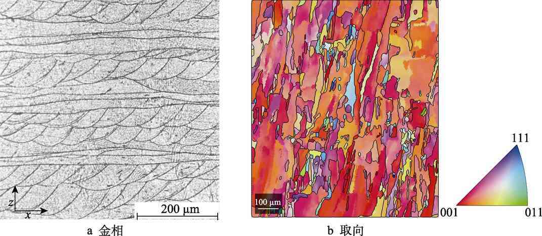 圖3所示為試樣xz 面的微觀組織形貌,其中圖3a為熔池形貌,圖3b為晶粒形貌及取向。由圖3a—b可知,xz 面晶粒形貌為沿沉積方向延伸的柱狀晶,柱狀晶晶內(nèi)取向差異不大,并且柱狀晶的生長穿過了熔池邊界,跨越了多個沉積層。這是因?yàn)樵诜蹖尤廴谀踢^程中,熔池的溫度梯度可以高達(dá)105 K/m,處于柱狀晶生長的凝固條件內(nèi)。同時,激光穿透了前一粉層熔融時所形成的熔池,前一粉層熔池和沉積層界面上未熔化的晶粒為新柱狀晶的外延性生長提供了形核點(diǎn)[14],因此,激光粉床熔融GH4169合金的晶粒組織以沿著沉積方向延伸的柱狀晶為主,并且晶內(nèi)的取向差異較小。此外,由圖3b可知,晶粒形貌雖然不規(guī)則,但大部分沿著<001>方向生長,這是因?yàn)镚H4169合金的基體為面心立方結(jié)構(gòu),<001>方向?yàn)槠渚ЯiL大的擇優(yōu)取向[15]。
