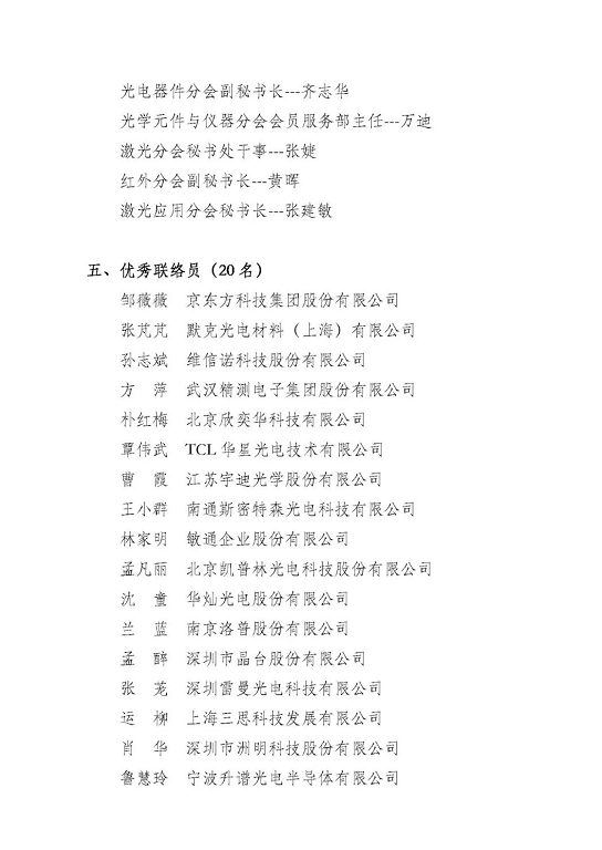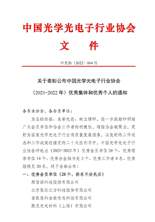 為總結(jié)經(jīng)驗(yàn)、表彰先進(jìn)、樹(shù)立榜樣,進(jìn)一步鼓勵(lì)和調(diào)動(dòng)廣大會(huì)員單位和協(xié)會(huì)工作者的積極性,增強(qiáng)協(xié)會(huì)凝聚力,更好為國(guó)家光學(xué)光電子行業(yè)高質(zhì)量發(fā)展服務(wù),以良好的工作狀態(tài)和工作成效迎接黨的二十大勝利召開(kāi),中國(guó)光學(xué)光電子行業(yè)協(xié)會(huì)評(píng)選出(2021-2022年)優(yōu)秀會(huì)員單位28個(gè)、優(yōu)秀理事單位14個(gè)、優(yōu)秀分會(huì)秘書(shū)處2個(gè)、優(yōu)秀工作者8名、優(yōu)秀聯(lián)絡(luò)員20名,現(xiàn)予表彰公布: