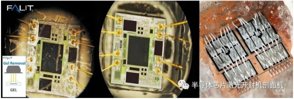 激光去除硅膠封裝,是利用遠紅外激光器,汽化silica gel,結(jié)合ECO-GEL溶液,完美除膠直達晶圓層。目前應用的IC主要類型有LED、IGBT、以及高壓功率芯片。