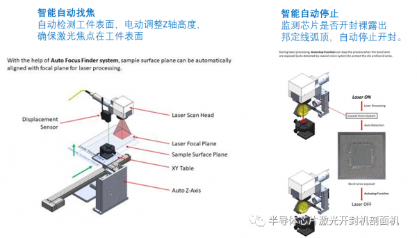 激光開封是利用激光聚焦能量,汽化EMC(epoxy mould compound)塑封層的工藝??商娲鷤鹘y(tǒng)的微型CNC機械磨除方法,結(jié)合ECO-BLUE工藝,可替代開封的后續(xù)滴酸工藝。