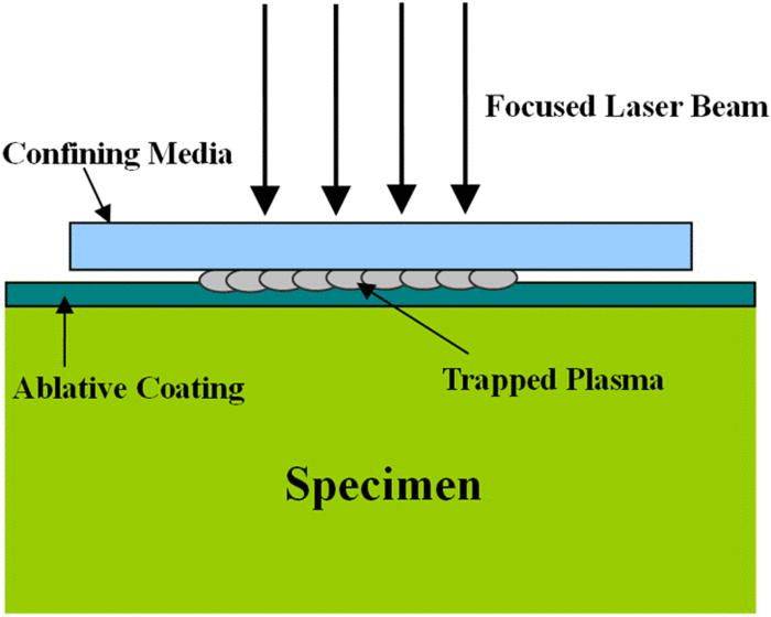 上圖為WLSP實驗設(shè)置示意圖。在WLSP過程中,將目標(biāo)材料加熱到一定的加工溫度??梢圆捎枚喾N加熱方法來提供熱能。在目標(biāo)樣品的上表面放置一層燒蝕涂層材料,以吸收激光能量,并保護(hù)樣品表面不受任何不必要的損傷。當(dāng)聚焦脈沖激光能量到達(dá)樣品表面時,燒蝕涂層被汽化和電離,形成激光誘導(dǎo)的等離子體。激光誘導(dǎo)等離子體的水動力膨脹受到置于燒蝕涂層之上的透明約束介質(zhì)的限制。從而產(chǎn)生激光誘導(dǎo)的沖擊波并傳播到目標(biāo)材料中,產(chǎn)生有益的塑性變形。
