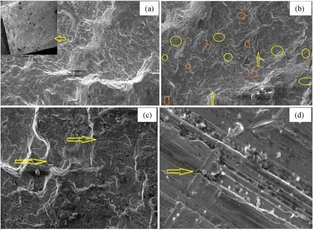 圖11 (a)激光沖擊(插入圖像是斷口的宏觀視圖)(b)熱激光沖擊(c)熱激光沖擊+1小時沖擊回火和(d)裂紋擴(kuò)展放大圖像的疲勞測試斷口形貌SEM圖像。
