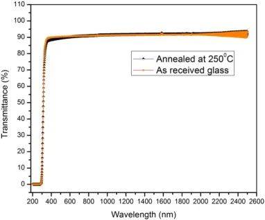 采用高Si、Mn含量的中碳低合金彈簧鋼SAE 9254(900°C硬化,400°C回火)進(jìn)行激光表面改性。在室溫(25°C)和預(yù)熱(250±15°C)條件下,采用低能量Nd: YAG激光器(Litron, UK) (300 mJ),脈沖持續(xù)時間為10 ns,基頻為1064 nm。為溫態(tài)LSPwC制備了光滑均勻的表面。BK7玻璃限制層厚度為1 mm。本例中,通過調(diào)整WLSP參數(shù),使限制玻璃層與脫碳表面鋼的沖擊阻抗匹配,達(dá)到峰值壓力。在優(yōu)化過程中,5 Hz和10 Hz脈沖重復(fù)頻率處理的樣品無顯著差異。兩種實驗均采用透光率在90%左右的硼硅酸鹽玻璃(BK7)作為限制層,通過紫外-可見(UV-Vis)光譜儀進(jìn)行驗證,如圖1所示。
