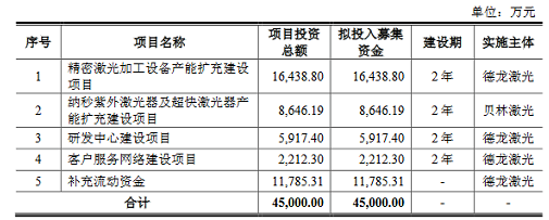 德龍激光本次擬募集資金4.5億元,投向四大項目建設(shè)及補充流動資金。