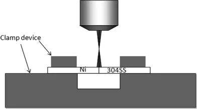實驗中使用了304不銹鋼和鎳。焊接前用丙酮清潔表面。在一臺具有五軸數(shù)控工作站的1kW Nd:YAG激光材料加工系統(tǒng)上進行了實驗。150毫米焦距透鏡用于聚焦激光束。離焦距離為9.5mm,試樣頂面對應的光束半徑為1.0mm。使用650 W的激光功率,相互作用時間為500 ms。圖1顯示了尺寸為20 mm×10 mm×2 mm的304不銹鋼和鎳板的激光點焊示意圖。