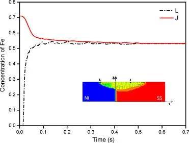 圖8顯示了遠離熱源0.5 mm的兩個位置的鐵濃度變化。如圖所示,熔池形成后,元素快速混合。因此,在熔化的初始階段,不銹鋼側(cè)的鐵濃度降低,而鎳側(cè)的鐵濃度升高,且速度很快。隨著兩個位置的濃度差減小,質(zhì)量傳輸變得更加緩慢。因此,在不銹鋼和鎳的激光點焊過程中,兩個位置的濃度差和質(zhì)量傳輸速度都會隨著時間的推移而減小,直到元素分布變得均勻為止。