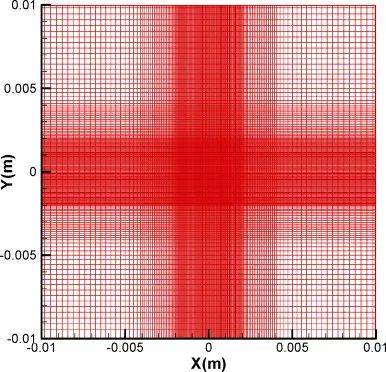 整個矩形計算域被劃分為小的矩形控制體??刂品匠淘诮诲e網(wǎng)格上用控制體積法離散。壓力、溫度、物種濃度等標量存儲在計算單元的中心。速度分量存儲在相應的單元面中心。數(shù)值解的一般框架基于SIMPLEC算法。使用159×160×50網(wǎng)格的非均勻網(wǎng)格,在熱源附近使用更細的網(wǎng)格。最小網(wǎng)格間距為20μm。上表面用于數(shù)值模擬的網(wǎng)格如圖2所示。