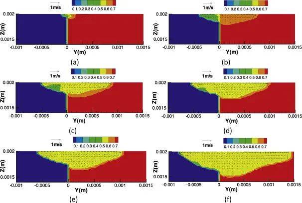 圖3(a–f)顯示了兩種情況下在加熱期間不同時間計算的溫度場和速度場的比較。圖中的輪廓值表示以Kelvin為單位的溫度。黃色和紅色部分代表液體區(qū)域??梢钥闯?,在這兩種情況下,遠離熔池的溫度場在不同時間是相似的,這表明了在傳統(tǒng)焊接力學中忽略流體流動和質(zhì)量傳輸?shù)囊恍┖侠硇?。然而,對于靠近熱源的區(qū)域,情況卻截然不同。對于情況1,熔合區(qū)更深、更窄,并且具有半球形,這是由于能量僅通過熱傳導從激光束中心徑向傳輸而產(chǎn)生的。峰值溫度總是在304不銹鋼一側(cè),因為其導熱系數(shù)遠低于鎳。對于情況2,當考慮流體流動和質(zhì)量傳輸時,由于最大熱輸入通量,峰值溫度向激光束中心移動。當表面張力的溫度系數(shù)為負值時,流體從激光束的中心(表面張力變?。┝飨蛉鄢氐耐鈬?,增強了從熱零件到冷零件的能量傳輸。因此,情況2的峰值溫度遠低于情況1(2423 K vs 3058 K),并且在加熱期間,熔池中的溫度梯度較小。圖4(a–d)顯示了兩種情況在冷卻循環(huán)期間計算的溫度場和速度場的比較。在激光器關(guān)閉后,情況2的熔池僅保持液態(tài)30 ms,而情況1的時間要長得多(約140 ms)。