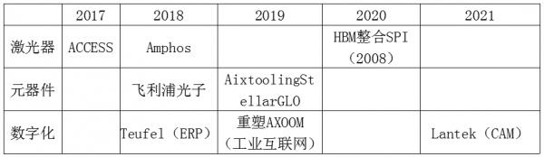 它在做三方面的考慮。第一是豐富產(chǎn)品線。2012年收購(gòu)了美國(guó)JPSA,拓展微細(xì)加工領(lǐng)域。后者的紫外線、準(zhǔn)分子激光器,在陶瓷、玻璃和半導(dǎo)體微加工業(yè)務(wù)獨(dú)樹一幟。而在2017年收購(gòu)的光柵公司OptiGrate,則加強(qiáng)激光光路系統(tǒng)的完整性。