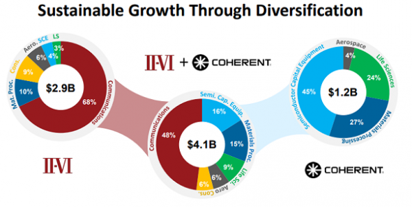 而今年1到3月則是II-VI經(jīng)歷的驚心動(dòng)魄一刻。一月份,全球光器件老二Lumentum宣布以57億美元收購(gòu)相干Coherent。話音未落,二月份美國(guó)另外一家儀表及激光器生產(chǎn)商MKS宣布報(bào)價(jià)66億美元,Coheren進(jìn)行了認(rèn)真的評(píng)估。同時(shí)II-VI作為第三位求婚者入局。三月份,搖擺不定的Coherent呈現(xiàn)了“令人生厭”的一面,最終倒向了II-VI,作價(jià)65億美元。