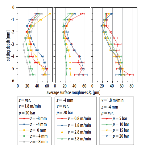 在保持焦點位置和輔助氣體壓力的同時,增加切割速度(v)會導(dǎo)致表面粗糙度的整體降低,從而降低的程度隨切割深度而變化很大(圖3,中間)。最低平均表面粗糙度(Rz≈ 20μm),對切割速度的依賴性最低,約為切割深度的1/3至1/2。在更大的切削深度下,所有四種檢查切削速度的平均表面粗糙度都會增加。分析粗糙度深度隨焦點位置和輔助氣體壓力的變化,得出切割深度上的類似輪廓(圖3a和3c)。從板材的上邊緣開始,平均表面粗糙度降低至試樣厚度的前三分之一至一半,并增加至板材的下邊緣。對于所有研究的切削參數(shù),切削深度上的表面粗糙度大致為S形(圖3)。