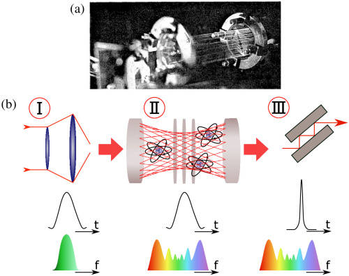 然而,在激光脈沖本身有非常高能量的前提下,因光纖和激光燈絲的方法由于自身器件損壞,不能保持應(yīng)有的波導(dǎo)性質(zhì)而不再適用。在德國(guó)電子加速器和耶拿-亥姆霍茲中心的研究者發(fā)現(xiàn)了在高能激光條件下適用的光譜展寬方法。這種方法要求使用兩面鏡子對(duì)激光進(jìn)行重新聚焦形成多次反射,并在腔內(nèi)放置多片非線性玻璃。