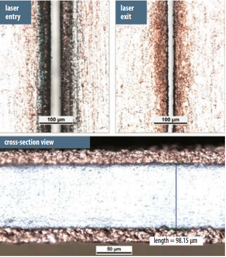 圖2用類星體UV80激光切割的厚覆銅LCP。入口(左上角)、出口(右上角)和橫截面(底部)視圖展示了通過(guò)時(shí)間定制的ns脈沖實(shí)現(xiàn)的干凈、高質(zhì)量的切割。