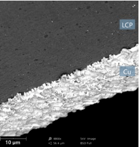 特別值得注意的是LCP切割邊緣的光滑度和垂直度,沒有明顯的“桶裝”或從銅鋪管機(jī)的切割邊緣拉回。高度放大的界面SEM視圖如圖4所示,并確認(rèn)LCP和Cu層之間的結(jié)合得到了很好的保留。更詳細(xì)的細(xì)節(jié)還顯示了光滑平坦的LCP表面,沒有任何從切割銅邊緣拉回的痕跡。
