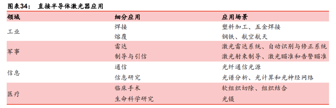 直接半導(dǎo)體激光器特點(diǎn)明顯,下游應(yīng)用領(lǐng)域廣泛。直接半導(dǎo)體激光器結(jié)構(gòu)緊湊,維護(hù)費(fèi)用低,電光轉(zhuǎn)換效率高達(dá)47%,在工業(yè)中主要應(yīng)用為焊接及熔覆。低功率半導(dǎo)體激光器主要應(yīng)用于塑料焊接以及錫焊,通過光纖輸出焊接,實(shí)現(xiàn)非接觸遠(yuǎn)距離操作,方便與自動(dòng)化生產(chǎn)線集成;千瓦級(jí)直接半導(dǎo)體可用于熔覆及五金焊接,具有光斑大、電光轉(zhuǎn)換率高的特點(diǎn)。在工業(yè)外領(lǐng)域,半導(dǎo)體激光器也被廣泛用于軍事、信息及醫(yī)療和生命科學(xué)等方面。