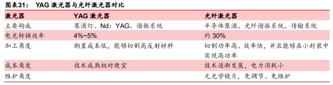 隨著光纖激光器的發(fā)展,YAG激光器或?qū)⒅饾u被替代。YAG激光器在工業(yè)中主要用于切割和焊接工藝,但隨著光纖激光器的發(fā)展,YAG激光器或逐漸被光纖激光器所替代。在切割領(lǐng)域中,YAG激光器購置成本低,能切割高反光材料,但加工功率低、能耗比大且切割速度較慢,而光纖激光器功率高效率快且免調(diào)節(jié)免維護(hù);在焊接領(lǐng)域中,準(zhǔn)連續(xù)光纖激光器出現(xiàn)后開始快速替代脈沖Nd:YAG激光器。與 YAG 激光器相比,準(zhǔn)連續(xù)光纖激光器可以在微秒至毫秒的脈寬下提供數(shù)焦耳到數(shù)十焦耳的脈沖能量,其較高的平均功率和脈沖重復(fù)頻率顯著提高了加工速度以及生產(chǎn)效率,相當(dāng)于同時(shí)具備YAG激光器的鉆孔和焊接優(yōu)勢以及CO2激光器的切割能力,應(yīng)用范圍更廣泛。